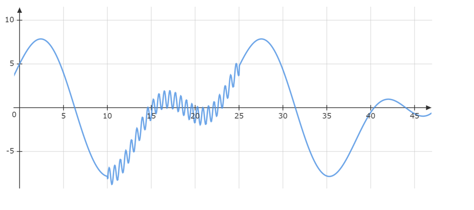 Thus, we see that reducing the time step, the local truncation error reduces quadratically. The value of the error will also be governed by \(\ddot{u}_n\) and \(\dddot{u}_n\). The higher these quantities, the larger the error. Let us now assume that we have a solution where these two quantities have different orders of magnitude during the simulation time, as depicted in the figure below.