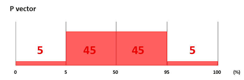 Given that 3 quantiles are elicited, the realizations of the calibration questions should fall on one of the 4 inter-quantile intervals with probability vector \(p = (0.05, 0.45, 0.45, 0.05)\).