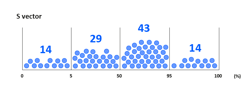 First, we compute the \(s(A)\) by counting the number of times that the realization falls in a given interquantile range. We obtain