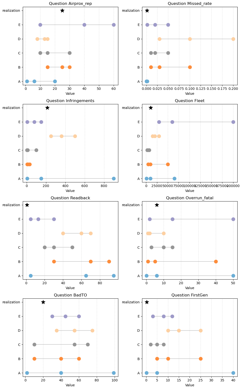 Fig. 84 Example of 4 seed questions with 5 experts (A, B, C, D, E). Each panel represents a seed question. The dots represent the 5th, 50th and 95th percentiles given by the expert.#
