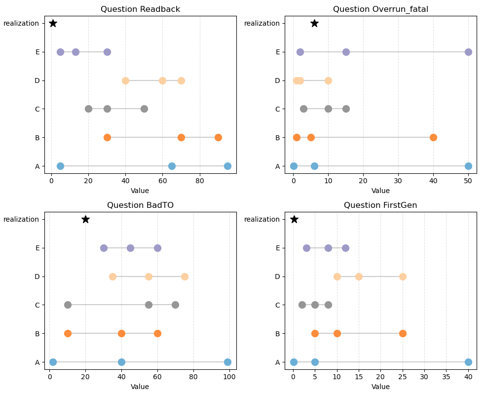 Fig. 81 Example of 4 seed questions with 5 experts (A, B, C, D, E). Each panel represents a seed question. The dots represent the 5th, 50th and 95th percentiles given by the expert.#